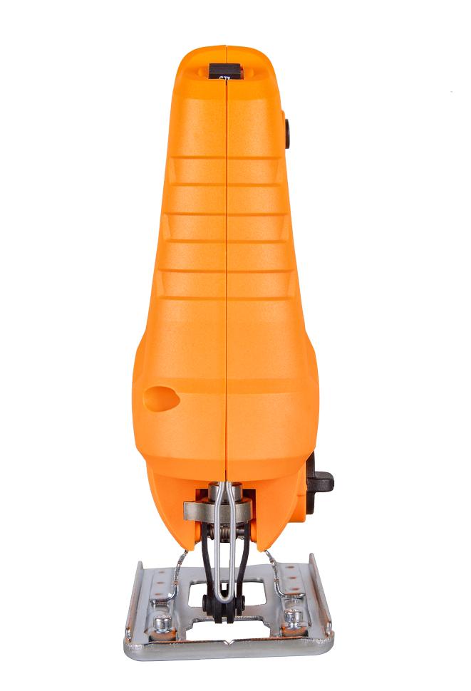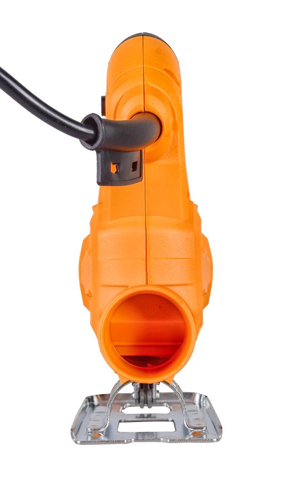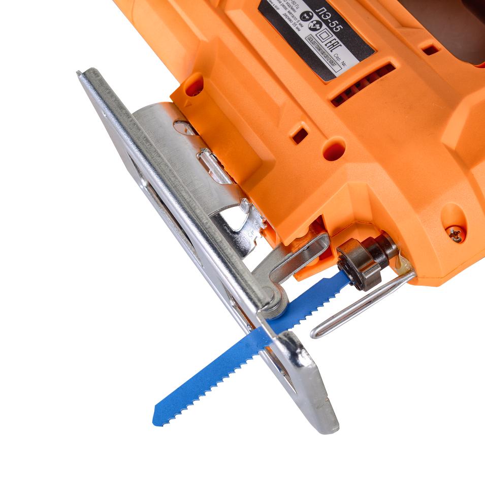 Работу механизма обеспечивает надежный электрический мотор, расположенный в нижней части пластикового корпуса со специальными отверстиями для вентиляции. Выключатель имеет защиту от непреднамеренного запуска двигателя, что повышает безопасность устройства. Электролобзик рассчитан на использование оснастки разного вида, пилки легко заменять благодаря быстрозажимной конструкции. Скорость пиления можно менять, подбирая оптимальный режим в диапазоне от 500 до 3000 ход/мин. Для выполнения косых пропилов можно регулировать наклон подошвы. Наличие маятникового хода способствует улучшению качества и повышению эффективности при выполнении грубых резов. Модель оснащена боковой направляющей, которая помогает делать пропил параллельно кромке заготовки. Лобзик обеспечит пропил дерева на 65 мм, металлических заготовок – на 7 мм. Для поддержания чистоты рабочего места рекомендуется подсоединение устройства к пылесосу.