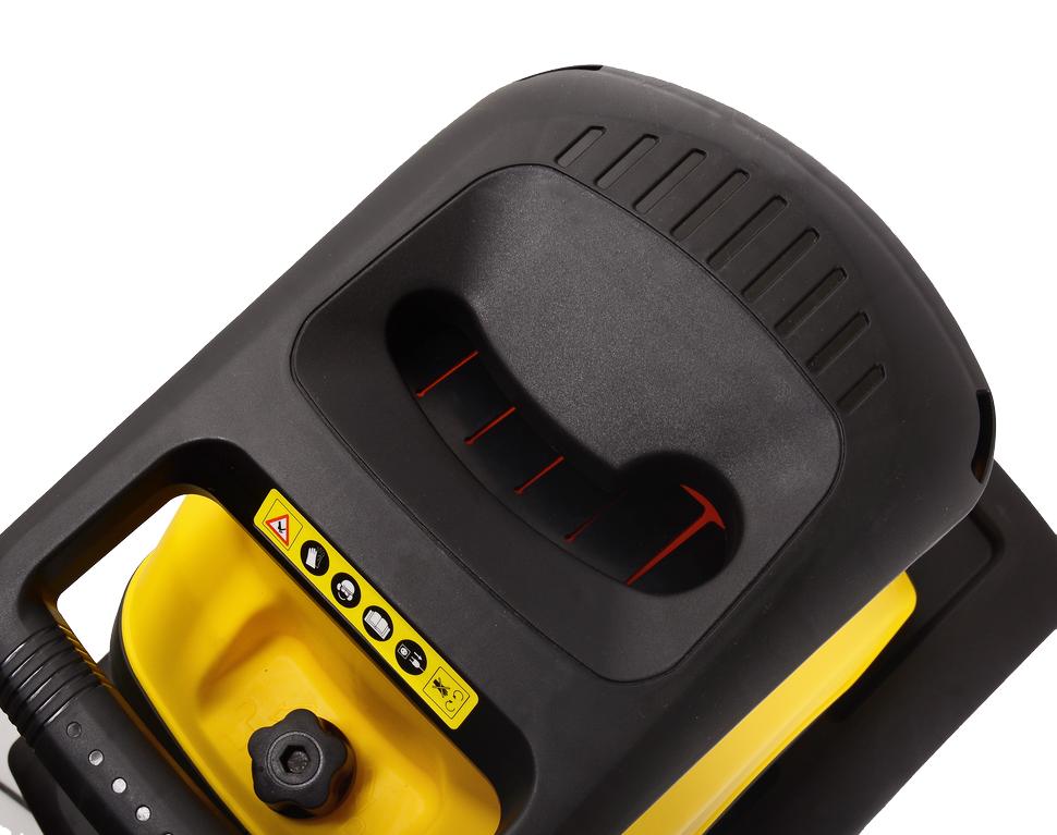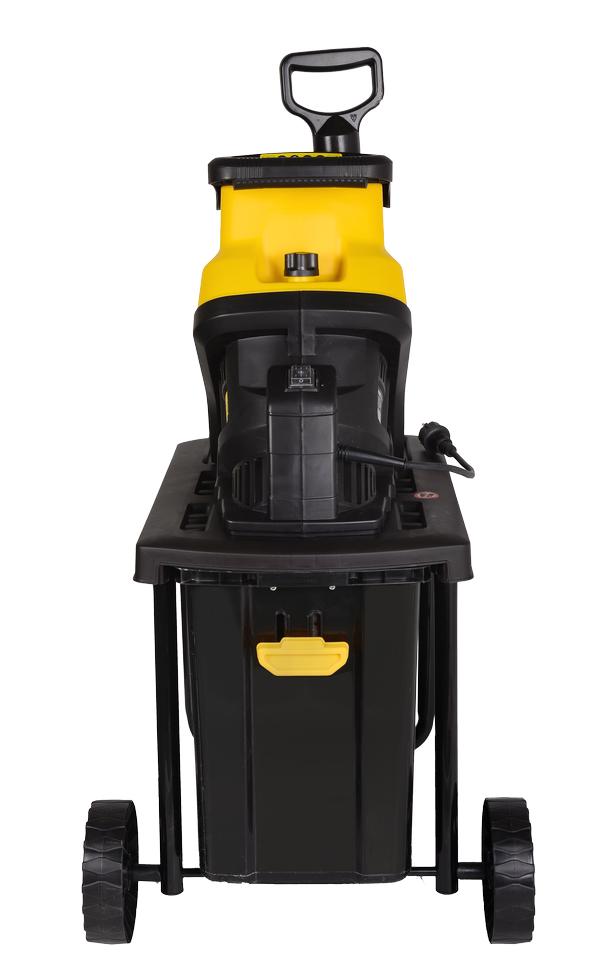 Конструкция измельчителя веток максимально продумана для комфортности и безопасности использования. Устройство имеет плавный пуск и защиту от перегрузки. Агрегат установлен на широкой раме и оснащён колёсами для удобства перемещения по участку. Загрузочное отверстие имеет особую форму, которая не позволит руке попасть в режущую часть. Садовый измельчитель комплектуется специальным толкателем, которым рекомендуется пользоваться для подачи древесного материала. Мощность электродвигателя составляет 2500 Вт, что позволяет установке легко измельчать ветки диаметром до 4,5 см. Модель оснащена дисковой ножевой системой, которая лучше других справляется с тонкими сучьями и прочими древесными отходами. Готовая мульча собирается в большой пластиковый контейнер.
