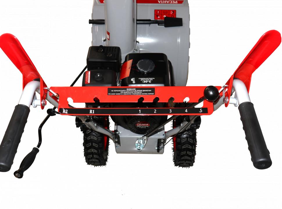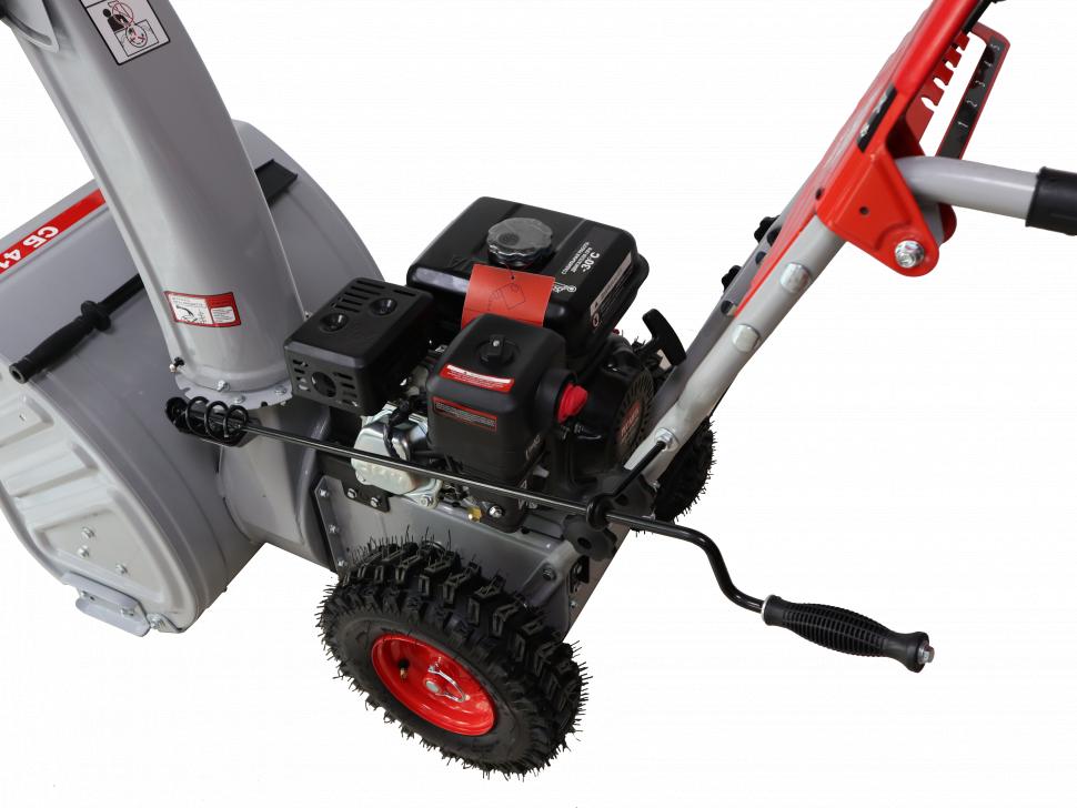 Колёсный самоходный снегоуборщик поддерживает 5 скоростей в направлении вперёд и 2 назад. Благодаря металлическому шнеку он измельчает даже пласты обледеневшего снега. Снежную крошку подхватывает поток ветра, созданный вентилятором, и отбрасывается в сторону через специальный желоб. Это обеспечивает быструю и эффективную уборку небольшого земельного участка зимой. Выброс снега удобно регулировать с помощью специального рычага.