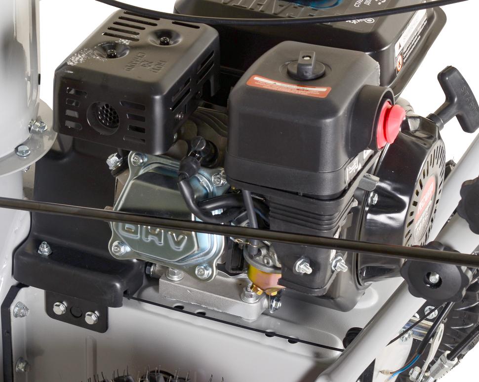Ковш устройства захватывает пласты снега, при этом лопасти шнека размалывают даже заледеневшие, уплотненные участки покрова. Для удобства оборудование снабжено рычагом регулировки направления, в котором происходит выброс собранного снега.